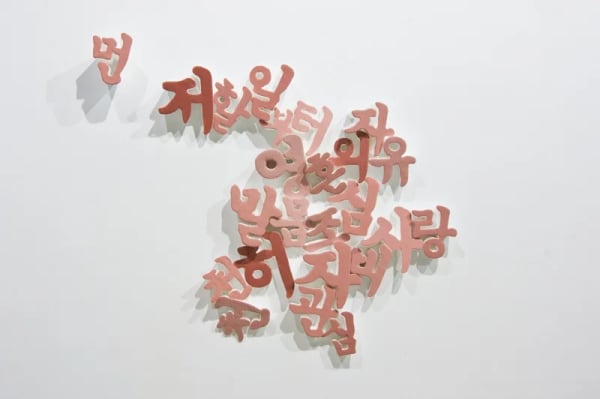 낯익은 풍경처럼 우리 생활에 익숙한 소리인 "먼저 할 일부터","천천히","영혼의 자유","말, 몸조심","관심","자비","사랑"이 벽 한 면에 부유한다. 이는 활자 조각가로 알려진 노주환 작가가 생활신조로 일상에 품고 다니는 글귀들이다. 그 주변엔 우리의 지혜를 어느 때보다 불멸의 존재로 만든 인쇄술을 가능케 한 금속 활자에 대한 작가의 오마주인 일련의 활자 책들이 보인다. 영롱한 지혜가 수면 위로 떠오르듯 무작위로 배열된 활자를 배경으로 다양한 높낮이로 올라 온 문자들은 경구를 그려낸다. 그는 자신의 생활신조와 활자 책이 펼쳐 보인 경구처럼 우리에게 친숙한 단어와 문장을 엮어 이번 전시를 풀어내고 있다. 우리 역사와 지형을 품은 활자 조각이 그동안 만들어낸 장대한 풍광과 달리 여기의 문자들은 활자라는 틀에서 벗어나 다채로운 모습으로 우리 삶을 마주한다.