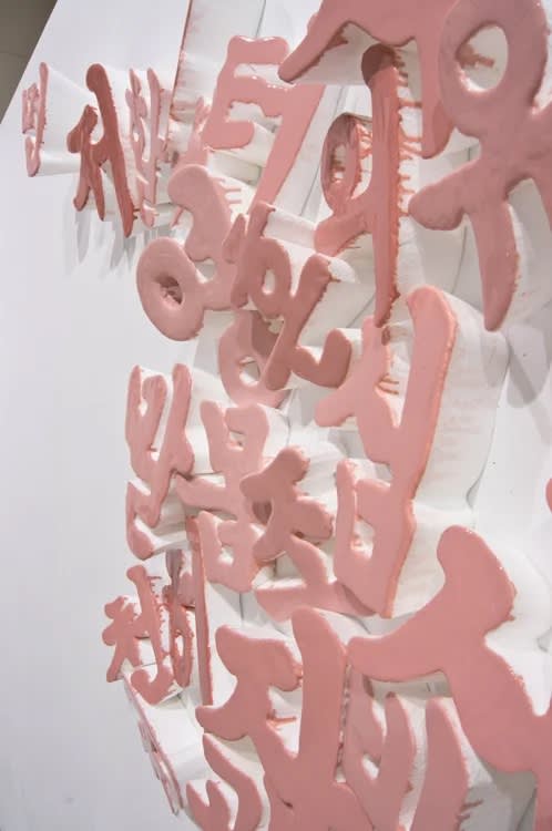 이렇게 속담 혹은 단어를 우리 삶의 기표로 그려낸 노주환은 두 개의 층 벽에 부착한 『다라니경』에서 시각적 사유의 대상인 이미지의 경계를 촉각적 사유로의 확장을 시도한다. 마치 돌담벽을 스쳐가는 손끝마디의 감촉으로 『다라니경』의 한 글자 한 글자를 관람객은 탐독하게 된다. 이는 문자들이 모여 만들어내는 삶의 지혜가 관조의 대상으로 우리 앞에 펼쳐지기 앞 서 우리 삶에 스며들어 있음을 체험케 하는 과정이라 할 수 있다. 노주환은 이번 전시에서 속담과 같은 경구를 통해 우리 삶과 문자가 만나는 모습을 그려내고 조형함으로써 관람객으로 하여금 의사소통의 시각적인 기호 체계로서가 아닌 인류의 삶의 표징으로 문자를 조망하게 한다.