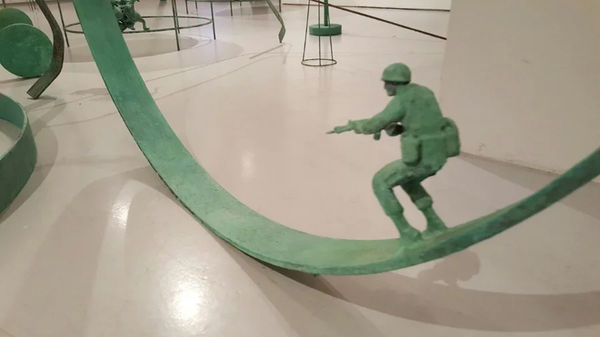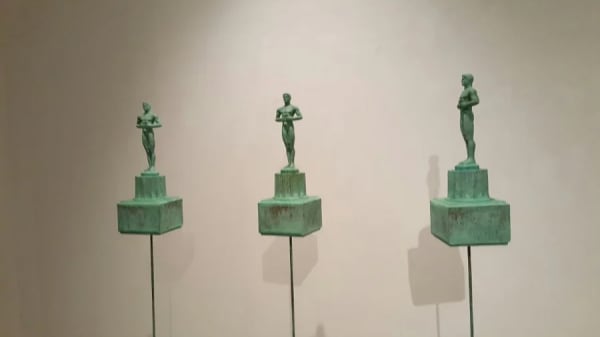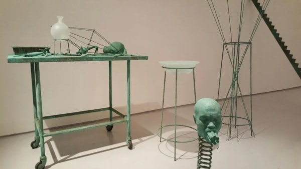 <덫> 시리즈의 작은 오브제들은 천장에 매달려 있는 두상과 높은 곳에서 미끄러지지 않으려고 바들바들 떨고 있는 소, 등 뒤로 점점 작아지는 자신의 모습을 얹고 있는 부처 등. 우스꽝스러운 모습들이지만 가만히 살펴보면 시간이 정지된 듯한 적막함이 느껴진다. 푸른 동록을 뒤집어 쓴 이 작은 오브제들은 마치 영겁의 시간을 견디어 온 부장품처럼 우리가 살아온 세상을 박제가 된 모습으로 보여준다.