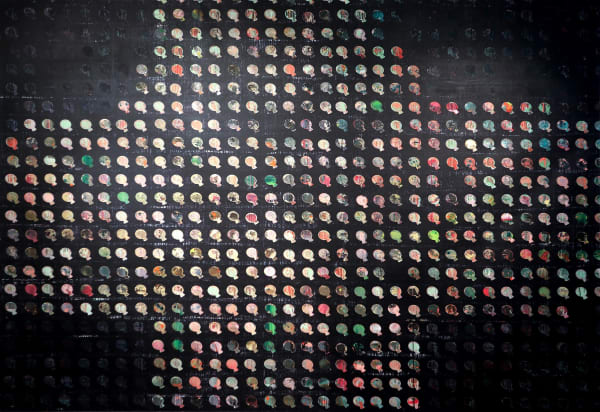 허정은 오랫동안 판화작업에 매진해왔다. 판화는 판에 비가시적으로 잠복된 가능성으로서의 0과 프린팅했을 때 가시적으로 드러나는 표현의 1을 반복하는 미술이다. 판화에 수반되는 레이어의 원리는 음양의 원리로도 설명될 수 있다. 음양이 합체된 그의 열쇠구멍 도상은 스티커 작업으로 구현된다. 스티커가 모인 한 판의 레이어는 판화의 한 판처럼 얹히는 꼴라쥬 작업을 거친 후 필요한 이미지만을 남기기 위해 데꼴라쥬 작업이 동원된다. 열쇠구멍 도상은 현상적인 존재감을 드러내기 위해 그림자가 첨가된다. 그림자들은 제각기 다각도의 무질서한 빛의 방향성을 갖는다. 이는 소실점의 혼란과 분열을 야기한다.