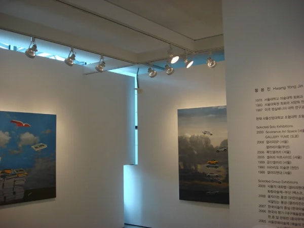 두 번째는 비교적 섬세하게 묘사한 풍경에 일련의 문명의 상징물들을 선명하게 대비시킨 근작들이 중심을 이룬다. 그런데 여기서 중요한 것은 앞서 길게 언급했던 어두운 분위기의 풍경화가 다시 등장하고 있다는 사실이다. 그러나 이번에는 판화잉크가 아니라 유성 물감이나 아크릴 칼라로 그린 점이 다르다. 아무튼 소재나 풍경의 내용은 이전의 것과 비슷한 느낌을 주고 있는데, 그것은 앞에 놓여진 대상들이 두드러져 보이도록 의도적으로 그린 것이 아닌가 여겨진다. 그는 다양한 시간대와 장소를 선정하여 숲이나 들녘, 벌판 등등 의도하는 분위기에 적합한 상황을 설정하여 문명의 부산물들을 대비시킨다. 그 방법은 가령, 영문판 원서들을 쌓아놓고 그 위에 시계를 올려놓는다든지, 책 더미 위 허공에 커피 잔을 띄워놓는다든지, 여러 대의 승용차를 허공에 흩트리거나 겹쳐놓는다든지, 겹겹이 쌓인 햄버거 위에 코카콜라 컵을 올려놓는다든지 하는, 일련의 배열법이다. 초현실적 느낌을 불러일으키는 이 방법은 이전에 꽃을 크게 확대함으로써 ‘낯선(異化:alienation)’ 느낌을 자아내던 기법과 어느 정도 연관된 것처럼 보인다. 싱싱한 생명력을 지닌 자연의 풍경과 문명의 산물들을 대비시키는 이 전략은 일종의 상투형(cliche)처럼 보일런지도 모른다. 그러나 황용진이 구사하는 이 방법은 이제까지 살펴본 것처럼 작업의 지속적인 진행에 의한 논리적 귀결이란 점에서 설득력이 있어 보인다. 그가 서로 다른 분위기와 느낌을 자아내는 다양한 풍경을 배경으로 햄버거, 매혹적인 여인의 벗은 사진이 담긴 병, 의자, 새, 신문지, 목걸이가 걸린 마네킹, 책, 승용차 등등의 사물을 사실적으로 묘사하는 이유는 단지 초현실적 느낌을 주기위한 것이 아니라, 거꾸로 자연과의 대비를 통하여 사물의 생생한 존재감을 표현하고 그렇게 함으로써 물성화된 인간의 욕망을 하나의 기호(sign)로써 파악, 문화 내지는 문명을 해석하고자 하는 의지의 발로인지도 모른다. '인간‘에서 시작해서 자연을 거쳐 이제 다시 자연과 인간의 문제를 화두로 끌어안은 황용진의 지칠 줄 모르는 정열은 그림을 통해 사물의 존재에 대한 질문을 새롭게 던지고 있는 것이다.