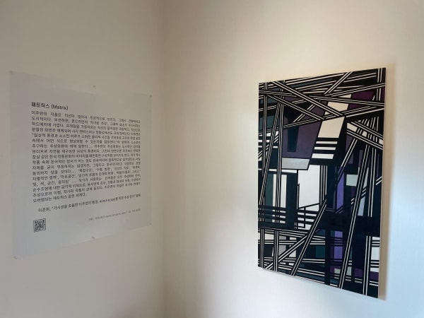 이주연의 작품은 직선이 많아서 인공적으로 보인다. 그래서 건축적이고 도시적이다. 부연하자면, 몬드리안의 ‘차가운 추상’, 그래픽 요소가 두드러지는 하드에지(hard-edge)에 가깝다. 프레임을 가로지르는 직선의 움직임은 과감하고, 직선으로 분할된 화면은 해체되며 사각 캔버스라는 정형성에서도 크게 벗어난다. 이주연은 “일상적 풍경과 소소한 하루가 스며든 물리적 시간을 기하추상 구조의 작업 공간 속에서 어떤 식으로 형상화할 수 있는지를 탐문한다.”라 밝히며 스스로가 추구하는 추상회화에 대해 말한다. … 이주연의 추상회화는 도시적인 감각을 모티프로 자연을 재구성한 심상의 풍경이다. 그런데 한편으론 조각보나 한옥 문 창살 같은 한국 전통문화의 이미지를 패턴화한 구성처럼 보이기도 한다. 작가 역시 작품 속에 한국적인 정서가 어느 정도 은유적이며 함축적으로 담겨있다는 사실 자체를 굳이 부정하지는 않겠지만, 그렇다고 한국적이라고 규정짓는 것엔 동의하지 않을 것이다. … ‘복합구조’, ‘수평 방향’, ‘시선의 각도’, ‘위계적, 차별적인 영역’, ‘자유공간’, ‘공간의 흐름과 단계적 변화’, ‘벽들의 통로’, 그리고 ‘빛, 색, 공간, 움직임’ …. 작가의 입에서 나온 말들은 하나같이 추상화된 언어, 순수조형에 대한 감각적 키워드뿐이다. 동서양의 조우, 전통과 현대의 조화, 구상에서 추상으로의 이행, 작가와 작품의 관계 등. 이주연의 작업은 과거와 현재가 오버랩되는 매트릭스 같은 세계다.