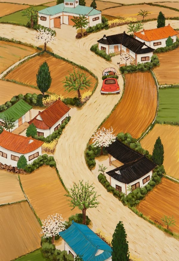 이번 『덜컹덜컹』 전시는 여행길 풍경을 통해 바쁘게 살아가는 현대인들의 삶을 인간적이면서도 따뜻하게 그린 마을 시리즈 『마을-봄, 여름, 가을, 겨울』을 비롯한 20여점의 다양한 작품을 선보인다. 여행 속에서 만나는 풍경들을 소재로 전개되는 작품들은, 불필요하고 거추장스러운 것들은 과감하게 던져버리고 꼭 필요한 것들만 챙겨서 여행길을 떠나는 것과 같이 ‘삶에서 가장 중요한 것은 무엇인가?’ 하는 화두를 던진다. 그림 속의 요란하지도, 특별하지도 않는 일상 속에 말없이 존재하는 사물들을 통해 시간의 체취를 느끼고, 그와 함께 더불어 살아가는 사람들의 감정과 정서를 느낄 수 있다. 우리 곁에 항상 함께하는 사물들은 인간보다도 더 인간적인 삶의 이야기를 조용하지만 묵직하고 가식 없이 전해준다. 주춧돌로부터 시작하여 차곡차곡 집을 짓듯, 붓끝에 인간사 희로애락과 삶을 묻혀 그림을 그리고 싶다고 말하는 작가의 마음처럼, 그의 작품은 인생의 참 맛이 그대로 녹아 들어 포근하게 일상을 조망한다.