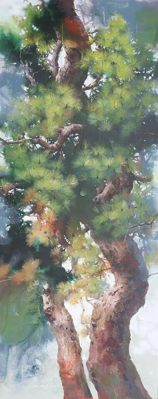 The artist evokes a feeling of empathy for the vitality of the delicate flowers that endured the harsh winter, and the permanence of nature in the green pine trees and the sea. Even though nature seems to be a different shape every time, it is constantly growing, blooming, and moving; this is an eternal and mysterious characteristic of nature that can only be understood by our consciousness. The world that Chulhwan Park has always desired to see and express begins with a view of awe for nature whose essence does not change forever. This indicates the result of his sincere effort to find the spiritual beauty inherent in nature.