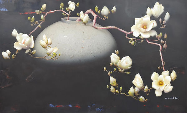 In addition to his mature and sensuous expression, Park's interest in oriental painting and its contemporary reinterpretation has greatly influenced his visual language. The artist expanded his artistic subject from the beauty and ugliness of the human body to the realm of the real world and the universe. Recently, he stated that he wants to paint "a still-life resembling portrait and literati painting." More than 20 artworks in the current exhibition are the result of Park's attempt to express the spirituality found in traditional literati paintings with the formal aesthetics of Western art. The artist selected many subjects often found in Korean literati paintings: pine trees that show off their greenness throughout the four seasons, white porcelain moon jars with elegant curves, pure white magnolias with the scent of spring, and peony. Moreover, behind his realistic and elaborate still lifes, Park painted abstract background to emphasize the beauty of blank space and to express his sensitivity in a rather indirect way. Although his artworks are so-called hyper-realistic still lifes that the image on the canvas comes to life more vividly than photographs, it is not his artistic purpose to simply reproduce what he sees. He seeks out unchanged imagery inside the objects and attempts to express the subtle and innocent spirituality of literary paintings.